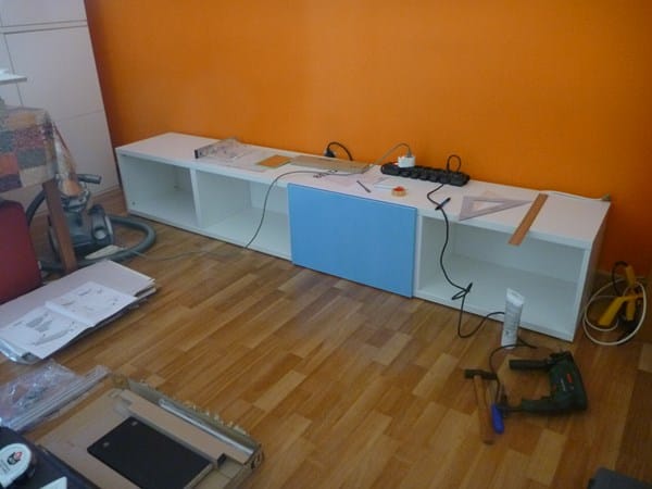 Como véis en la foto la base del mueble son dos módulos de Ikea de la serie Besta consiguiendo un conjunto de 2,40 m de ancho. Ahora quiero hacer una U invertida en madera de acacia que compré en Bauhaus que es para encimeras de cocina, el problema es que esta madera es de 2,20 de largo. Esta U invertida quiero que tenga el ancho de estos dos módulos pero descansando sobre el suelo. Para que os hagáis mi idea final es una mezcla de lo que se ve en esta foto que encontré por internet y en la que me he basado para mi proyecto: