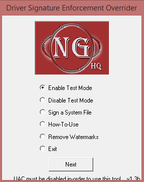 3. Ejecuta el Driver Signature Enforcement Overrider, pulsa "Next", luego "Yes" y elige "Enable Test Mode".