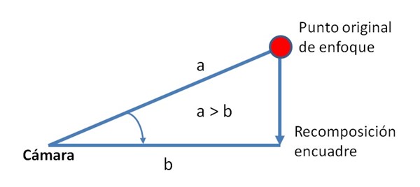 Sabemos que la profundidad de campo depende de la distancia al punto de enfoque, y al reencuadrar la imagen estamos variando la distancia original de enfoque como se muestra en el siguiente esquema: