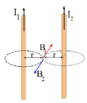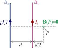 Dos conductores rectilíneos paralelos de longitud ilimitada transportan las corrientes I1= 4A e I2, ambas circulando en el mismo sentido. La distancia entre conductores es de 10 cm. Si el modulo del campo magneticoo en un punto situado entre ambos conductores a una distancia R1= 2,5 cm del conductor I1 es igual a cero.