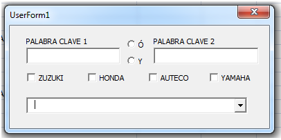 Tengo también los OptionButton (ó) y OptionButton (Y) que su función es que si el OptionButton (o) esta activo, el ComboBox me muestre en su lista desplegable solo las referencias que tiene una de las dos palabras, caso contrario es que si el OptionButton (Y) esta activo el ComboBox me muestre en su lista desplegable las referencias que tienen ambas palabras.