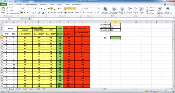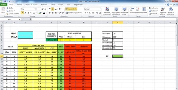 He estado buscando la manera de filtrar una fila que cumpla con dos condiciones. Me explico mejor, estoy haciendo tablas de nutrición infantil que me digan el nivel de desnutrición de acuerdo a la edad y peso. Anexo una imagen para que se den una idea. El usuario captura la fecha de nacimiento en la casilla E6 y en las casillas F6.G6 y H6 me da en automático los años, meses y días que tiene el niño respectivamente. Hasta ahí no tengo problema. Con estos datos busco posicionarme en la fila que cumpla con años y mese. Como en el ejemplo que tengo en la imagen (1 año, 5 meses) busco posicionarme en la fila 28, cosa que no he logrado por ningún método. Habiendo logrado esto, me viene otra interrogante, porque necesito también que me arroje automáticamente el nivel de desnutrición. Por ejemplo, el usuario solo captura la fecha de nacimiento en la casilla E6 y el Peso en la casilla C4, tomando en base el ejemplo de 1 año 5 meses y como ejemplo un peso de 7.1 entra en el rango de la columna D, específicamente casilla D28 y mi resultado en la casilla k11 deberá ser DM tomando en cuenta la tabla de grados de nutrición. Las siglas son DG para columna C...DM para D, DL para E, N para F, SBP para G y OBS para H.