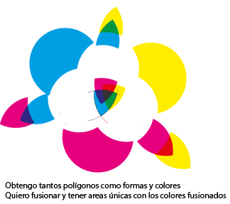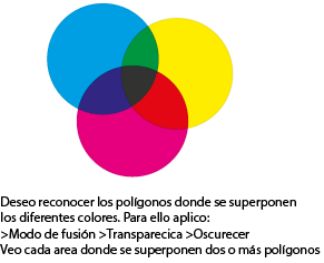 Para ello recurro a colores básicos CMY, que aplico a cada polígono. Luego una transparecia >Modo Fusión >Oscurecer y por lo tanto obtengo 7 colores: