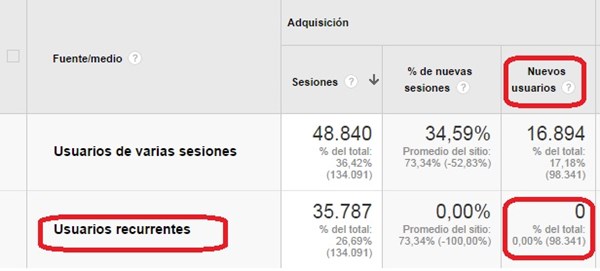 Una captura en la que podemos ver claramente cómo en los usuarios recurrentes no se tiene en cuenta las acciones de la primera visita: