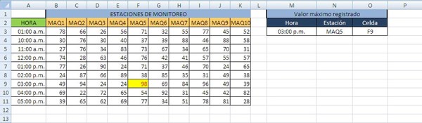 Tengo matrices de 10 columnas y 24 filas. Las filas representan cada una de las horas del día y las columnas corresponden a una estación de monitoreo de la calidad del aire. Lo que hago es obtener el máximo valor de los registros de un día. Y lo que quiero obtener es la hora (fila) y la estación en que se registró dicho máximo (columna).