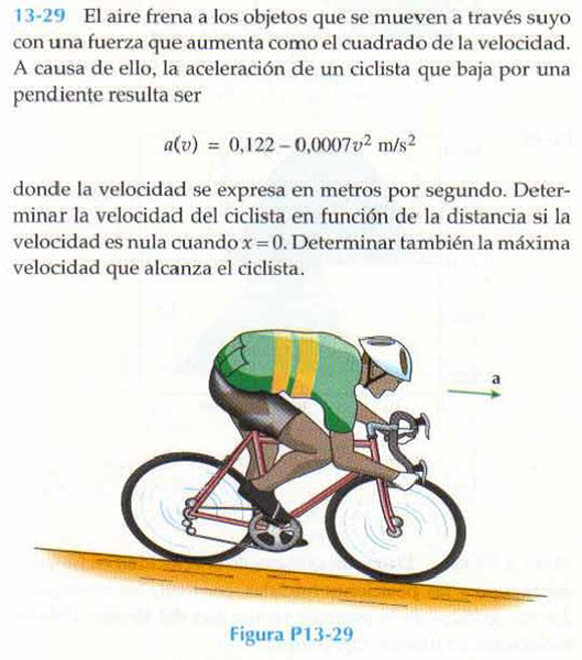 $$\begin{align}&a(t)=\frac {dv}{dt}= \frac{dv}{dx}·\frac{dx}{dt}=\frac {dv}{dx}·v\\ & \\ & luego\\ & \\ & 0.122- 0.0007 v^2 = v·\frac{dv}{dx}\\ & \\ & dx = \frac{v}{0.122-0.0007v^2}dv\\ & \\ & \text{integrando}\\ & \\ & x+C= \int \frac{v}{0.122-0.0007v^2}dv\\ & \\ & x+C=-\frac{1}{0.0014}\int \frac{-0.0014v}{0.122-0.0007v^2}dv\\ & \\ & x+C = -\frac{ln(0.122-0.0007v^2)}{0.0014}\\ & \\ & -0.0014(x+C) = ln(0.122-0.0007v^2)\\ & \\ & e^{-0.0014(x+C)}=0.122 - 0.0007v^2\\ & \\ & 0.0007v^2 =0.122- e^{-0.0014(x+C)}\\ & \\ & v^2 = \frac{0.122- e^{-0.0014(x+C)}}{0.0007}\\ & \\ & v= \sqrt{ \frac{0.122- e^{-0.0014(x+C)}}{0.0007}} \quad m/s\\ & \\ & \text{Calculemos C para que en x=0 sea v=0}\\ & \\ & 0 = \frac{0.122- e^{-0.0014(0+C)}}{0.0007}\\ & \\ & 0=0.122- e^{-0.0014C}\\ & \\ & e^{-0.0014C}=0.122\\ & \\ & -0.0014C = ln\; 0.122\\ & \\ & C = -\frac{ln\; 0.122}{0.0014}\\ & \\ & v= \sqrt{ \frac{0.122- e^{-0.0014(x-\frac{ln\; 0.122}{0.0014})}}{0.0007}} \quad m/s\\ & \\ & v= \sqrt{ \frac{0.122- e^{-0.0014x+ln\; 0.122}}{0.0007}} \quad m/s\\ & \\ & v= \sqrt{ \frac{0.122- 0.122e^{-0.0014x}}{0.0007}} \quad m/s\\ & \\ & v= \sqrt{\frac{0.122}{0.0007}}·\sqrt{1-e^{-0.0014x}}\quad m/s\\ & \\ & v=13.20173149 \sqrt{1-e^{-0.0014x}}\quad m/s\\ & \end{align}$$La velocidad máxima es cuando x tiende a infinito y la exponencial e^(-infinito)=0, con lo cual quedará
