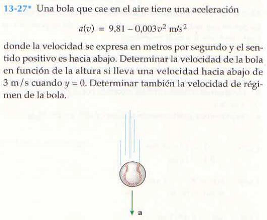 $$\begin{align}& \frac{ln(A+Bv^2)}{2B} = x+C\\ & \\ & \frac{ln(A+B·v_0^2)}{2B}=0+C\\ & \\ & C= \frac{ln(A+B·v_0^2)}{2B}\\ &\\ & v= \sqrt \frac{e^{2B\left(y+\frac{ln(A+B·v_0^2)}{2B}\right)}-A}{B}\\ &\\ &v=\sqrt{\frac{e^{2By}·e^{ln(A+Bv_0^2)}-A}{B}}\\ &\\ &v=\sqrt{\frac{e^{2By}(A+Bv_0^2)-A}{B}}\\ &\\ &\text{Y ssutituyendo tendremos}\\ &\\ &v(y)=\sqrt{\frac{e^{2·(-0.003)y}(9.81-0.003·3^2)-9.81}{-0.003}}\\ &\\ &v(y) = \sqrt{\frac{9.783e^{-0.006y}-9.91}{-0.003}}\\ &\\ &v(y)=\sqrt{\frac{9.91-9.783e^{-0.006y}}{0.003}}\\ &\\ &\text{Y la velocidad de régimen es cuando }\\ &\\ &y\to \infty\implies e^{-0.006y}\to 0\\ &\\ &v_r= \sqrt{\frac{9.91}{0.003}}\approx57.474632 m/s\end{align}$$