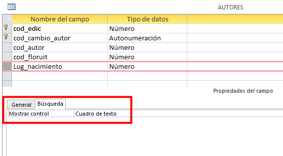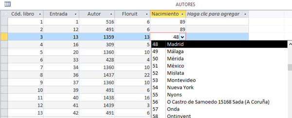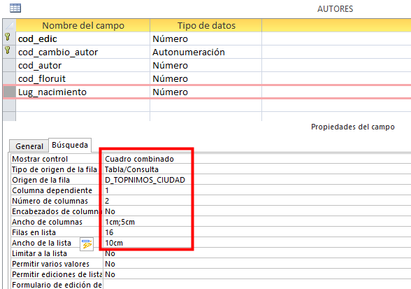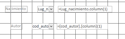 Los datos del subformulario los coges de una tabla AUTORES. Sin embargo, los datos de cada campo (cod_autor, lug_nacimiento y cod_floruit) lo coges cada uno de una tabla.