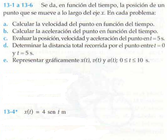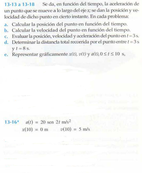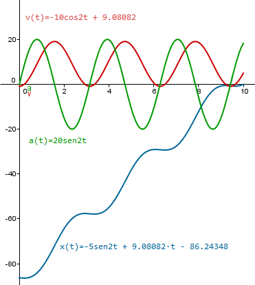 $$\begin{align}&v(t)=\int20\,sen\,2t\;dt = -10cos 2t + C\\ & \\ & \text{como v(10)=5 m/s}\\ & \\ & v(10)=-10cos(2·10) +C = 5\\ & \\ & C=5+10\,\cos 20\\ & \\ & v(t)=-10cos2t+5+10\,\cos 20\\ & \\ & v(t)=-10cos2t + 9.08082\\ & \\ & \\ & x(t)=\int(-10cos2t + 9.08082)dt=\\ & -5sen\,2t+ 9.08082t+C\\ & \\ & \text{Como x(10)=0 m}\\ & \\ & x(10)=-5sen20+9.08082·10+C=0\\ & \\ & C= 5sen 20-90.8082= -86.24348\\ & \\ & x(t)=-5sen\,2t+ 9.08082t-86.24348\end{align}$$c)
