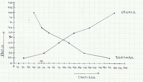 Pero ahora necesito determinar el precio y la cantidad de equilibrio... Y no se cual es... O como hacer el ejercicio. No es ni 100 (porque esta corrido un poco a la izquierda) y tampoco creo que sea 45 el precio