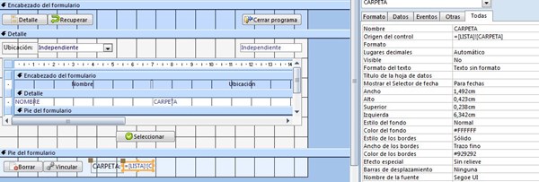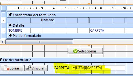 Tienes un formulario (de nombre ¿fselempresa lista?) Con un subformulario (de nombre ¿LISTA? ). Además en el formulario, tienes un cuadro de texto llamado CARPETA, que coje el valor del campo CARPETA de tu subformulario.