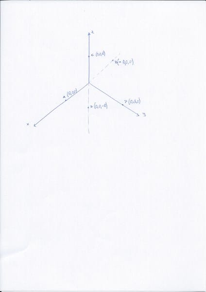 Se trata de calcular el vector campo eléctrico producido en el punto P(0, 5.0·10-6m, 0) por cuatro cargas puntuales en el vacío. Las cargas puntuales, de igual valor 2.7·10-6C, se encuentran en los puntos A(2.3·10-6m, 0, 0), B (-2.3·10-6m, 0, 0), C(0, 0, 2.3·10-6m), D(0, 0, -2.3·10-6m). Se pide indicar a continuación la componente Ey del campo eléctrico en N/C.