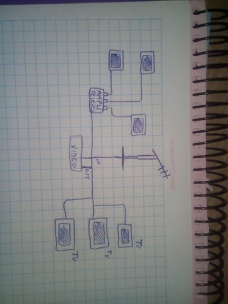 Decir que a día de hoy, sin haber quitado aun el video, la señal que tengo es lamentable, pues a excepción de la tv de comedor más cercana a la antena, el resto pillan muy pocos canales y además siempre pixelados. También decir que en la otra parte de la casa y alejada de la antena tengo puesto un amplificador (marca televés), que supuestamente debiera darle más señal a tres televisores más alejados que tengo, pero no es así. Adjunto esquema de como lo tengo, agradecería que me aconsejasen que aparato de los tres debo poner y si debería modificar de sitio el amplificador, gracias de antemano y saludos