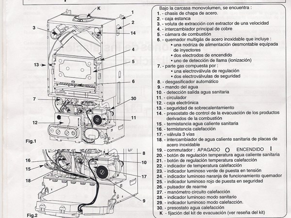 Si la caldera tiene aire, tienes que sacarlo por el purgador automático que tiene encima del circulador, tal como te dije en la primera respuesta, que te decia tiene un purgador automático, en este caso pone que viene a ser lo mismo desgasificador automático, que está en la figura de abajo, la pieza nº 8, pero que puede pasar que de la cal se haya obstruido el flotador y no deja salir el aire aunque aflojes el tapón, Hay una manera de hacerlo y es con cuidado desenroscar el desgasificador, ojo muy muy poco, la caldera desenchufada y en silencio a ver si se oye aire, tampoco está mal que le metas hasta dos bar, para que empuje mejor el aire.
