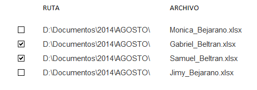 Supondré que las casillas de verificación están en la columna A, la Ruta la columna B y el archivo en la columna C