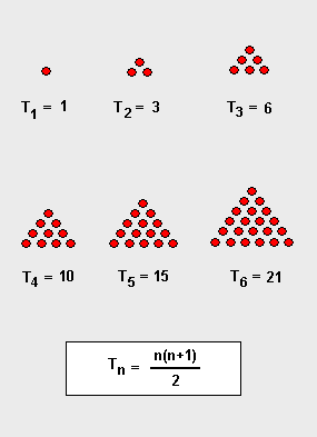 Un número triangular es aquel que puede recomponerse en la forma de un triángulo equilátero (por convención, el primer número triangular es el 1).