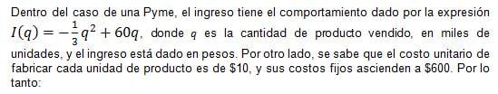 Dentro del caso de una Pyme, el ingreso tiene el comportamiento dado por la expresión, donde es la cantidad de producto vendido, en miles de unidades, y el ingreso está dado en pesos. Por otro lado, se sabe que el costo unitario de fabricar cada unidad de producto es de $10, y sus costos fijos ascienden a $600.