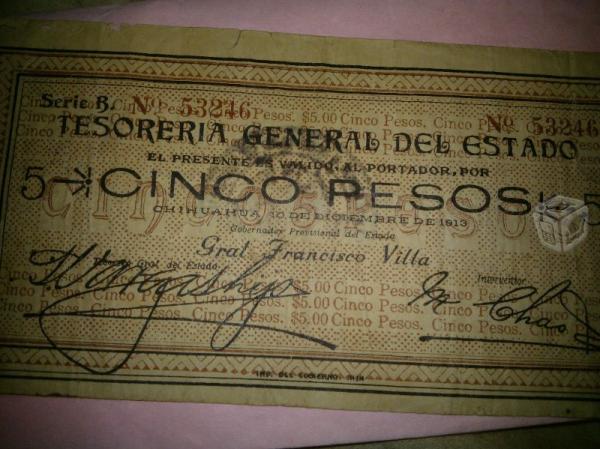¿Me podrían ayudar con el preció actual? Es un pagare que F. Villa fabricó en 1913 y circuló como papel moneda. Yo tengo uno de 5 pesos