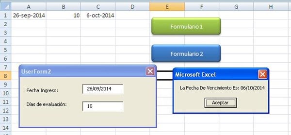 Hola Amigos Soy Principiante en Userform de Excel y me gustaría Aprender más de Maravilla del VBA de Excel. Quiero sumar una Fecha más Días y como resultado me de una fecha. Ejemplo: Fecha de Ingreso "A1"=26-Sep-2014 + Dias de Evaluacion "B1"=10 (días) = Fecha Vencimiento "C1"06-Oct-2014. Pero como lo dije anteriormente por medio de Userform. PD el resultado debe ser automático y que me aparezca un msgbox indicando cuando Vence.Y Muchas Gracias por Compartir sus Conocimientos