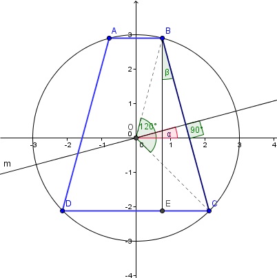 Al ser 120º el angulo COB la longitud del lado BC es siempre la misma, aunque en cada trapecio tenga distinta inclinación ese lado y con ello distinta altura. Inicialmente supongamos que el trapecio es un rectágulo, entonces el lado BC es vertical y el punto B se corresponde con 60º y el C con -60º.