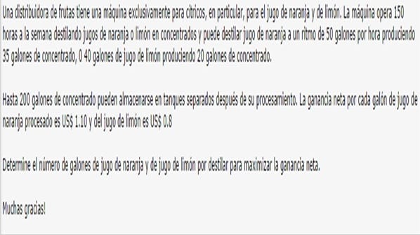 En el primero se ha obtenido una ganancia mayor, luego debe procesar la totalidad de jugo de limon. Esdecir, procesar 400 litros de jugo de limón para obtener 200 de concentrado de limón y no procesar nada de jugo de naranja.