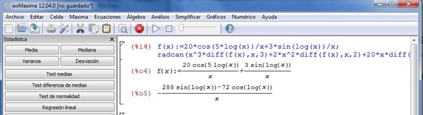 Lo primero definiremos la función, aquí hay que tener cuidado de escribirla bien ya que el ordenador no tiene la consideración de un maestro. Además, por estar usando Máxima, no podemos dejarnos ni un solo signo de multiplicar, en todo sitio donde haya una multiplicación debe aparecer un asterisco, en todo.