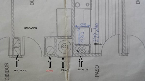 En el plano de mi pequeño piso hay muchos huecos que corresponden a columnas del aire acondicionado, a bajantes (los círculos) y ventilaciones (los rectángulos partidos), Pero hay uno al lado del termo que sale un símbolo de vacío (un circulo con una raya diagonal que lo parte. ¿Qué puede significar?
