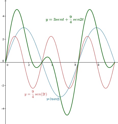 Muestra gráficamente la superposición de dos ondas que viajan en la misma dirección. La amplitud y la longitud de la segunda onda son iguales a tres cuartas partes y a la mitad, respectivamente, de las que corresponden a la primera onda.