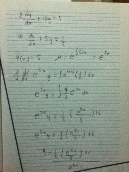 $$\begin{align}&\frac{2dy}{dx} + 10 y = 1\end{align}$$