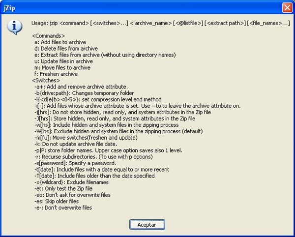 Pese a lo que dije más arriba respecto a la consideración de Jzip por el antivirus de McAfee como "potencialmente peligroso" he decidido descargármelo e instalarlo. Esto me ha permitido comprobar que para obtener la sintaxis del comando Jzip no vale el procedimiento indicado. En lugar de ejecutar C:\archivos de programas\jzip\jzip.exe se debe ejecutar C:\archivos de programas\jzip\jzip.exe /?