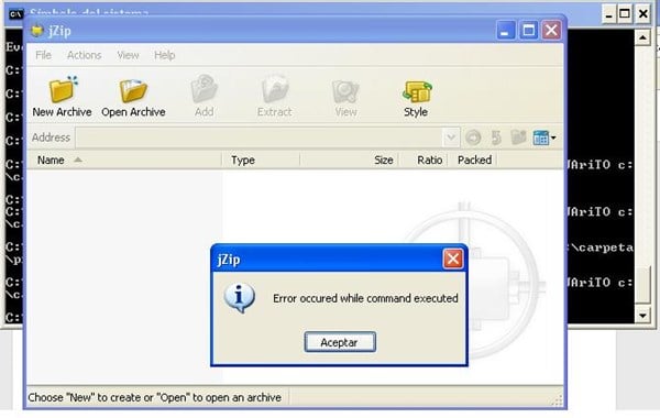 Si no entiendes algo de lo que te digo dímelo. Por si sirve para avanzar la apertura de una ventana CMD en Windows7 se puede hacer yendo a Inicio/Todos los programas/Accesorios/Ejecutar y escribiendo CMD en la casilla correspondiente. Se abrirá una ventana negra. Si, como supongo, el Jzip está en la carpeta de Archivos de programa, una vez en la ventana de CMD deberías escribir: