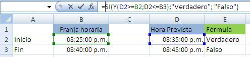 Qué código VBA o fórmula Excel puede decirme si en una hora determinada se encuentra entre dos horarios, por ejemplo: en una hoja Excel, en una celda, tengo las 20:25 y en otra celda las 20:40, ahora bien, en una tercera celda tecleo una hora prevista, por ejemplo las 20:35 y quiero que me indique al lado de esta última si esta hora (20:35) se encuentra entre las horas (20:25 y 20:40).