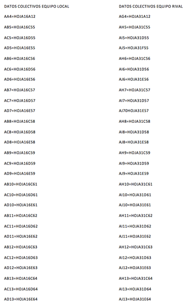 De esta manera aparecen separados por comas los participantes en el partido, es decir si en la celda CD13 aparecen 13 comas (",") es que han participado 14 jugadores (porque el último no lleva coma). Esto corresponderá a que desde la hoja2 hasta la hoja15 corresponderán al equipo local y a partir de la hoja16 serán los jugadores del equipo visitante (que aparecen separados entre comas en la hoja1 celda CD14 hasta el final de las hojas del libro)