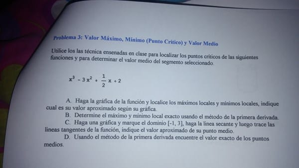 Utilice las técnicas ensenadas en clase para localizar los puntos críticos de las siguientes funciones y para determinar el valor medio del segmento seleccionado