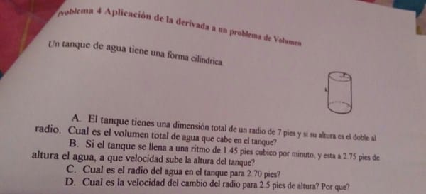 b.Si el tanque se llena a un ritmo de 1.45 pies cubico por minuto y esta a 2.75 pies de altura el agua, ¿a qué velocidad sube la altura del tanque?