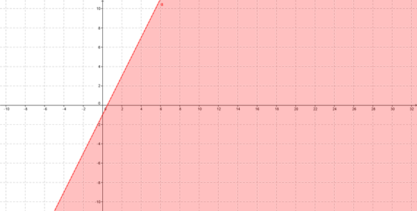 $$\begin{align}&10x-2-4+4x>y\\ &\\ &14x-6>y\end{align}$$Representas la recta 14x-6=y