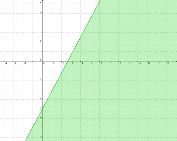 $$\begin{align}&\frac{3}{4}x-\frac{2}{5}y > 2\\ &\\ &Sacando \ denominadores: \\ &[\frac{3}{4}x-\frac{2}{5}y > 2]·20\\ &\\ &15x-8y>40\end{align}$$Graficando: