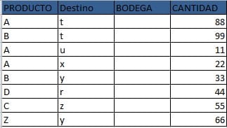 La hoja 1 tenemos producto, destino, bodega y cantidad