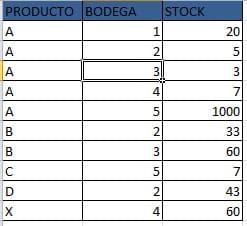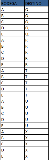 Si esa bodega encontrada tiene stock(el stock se encuentra en la hoja 2) para cumplir lo pedido copiamos a la hoja 1 la bodega de la hoja 3. Pasamos a la siguiente fila de la hoja 1 y se repite el proceso hasta la ultima fila de la hoja 1. Si el stock no es suficiente, pasamos a la siguiente bodega del destino buscado en la hoja 3, siempre habrá 5 bodegas para cada destino(estas estan ordenadas de menos distancia a mayor distancia del destino) en la hoja 3. En la hoja 2 puede que no esté la bodega encontrada en la hoja 3, asi que se debe pasar a la siguiente bodega de la hoja 3.