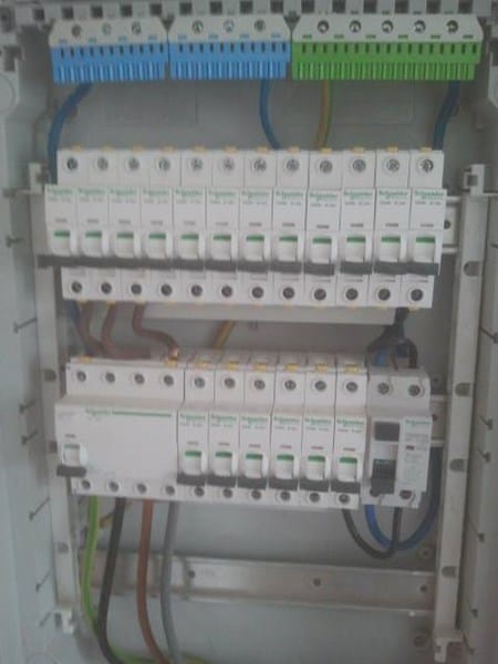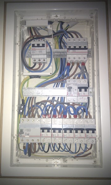 Hola, he estado siguiendo vuestros mensajes con bastante curiosidad, ya que no es un montaje muy común en España o por lo menos en mi zona. Por lo que he podido ver esto es de Alemania, ¿no? Es que me ha sorprendido mucho que ellos utilicen térmicos unipolares, cuando es mejor bipolares.Si me permites un comentario personal, hay muchos térmicos aguas abajo del diferencial de 4 polos. Cuantos más circuitos cuelgues de un diferencial, más pequeñas fugas pueden ir sumándose y aumentan las probabilidades de salte por fuga. De hecho la norma española sólo permite 5 térmicos por diferencial. - Anónimo