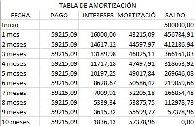 - Determina el valor de los pagos y elabora la tabla de amortización de una deuda de $500,000 la cual debe liquidarse mediante diez pagos mensuales vencidos con una tasa de interés de 3.2 % mensual.