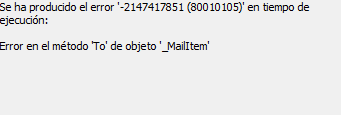 Hola Dante Amor yo tengo problemas al ejecutarla, precisamente el edpurador me pone en amarillo Set dam = CreateObject("outlook.application").createitem(0), y me aparece una ventana que dice "se ha producido el error 429" en tiempo de ejecución: El componente Active X no puede crear el objeto - Pedro A Bayly