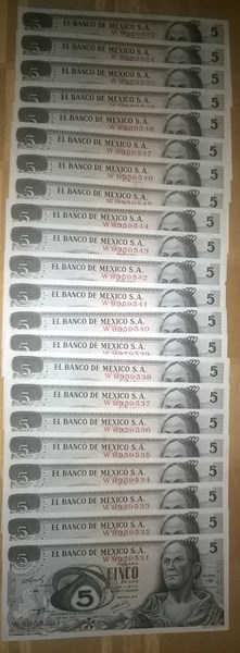 Tengo 15 billetes de 5 pesos de 1971 con serie continua y otros más de igual manera me gustaría saber el valor que puedan tener para un coleccionista en excelente estado