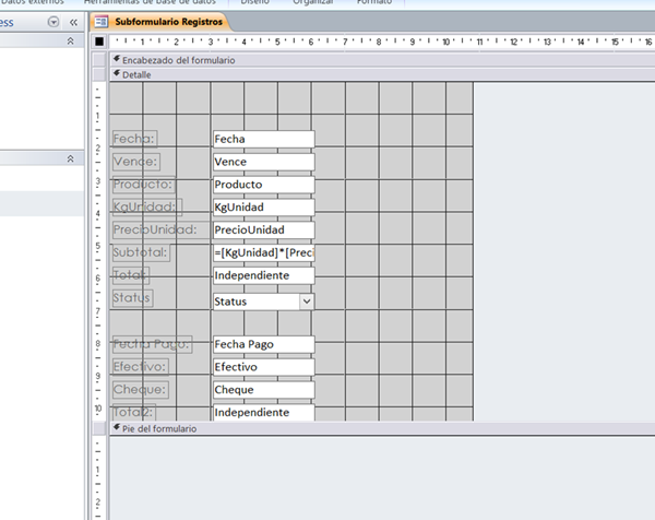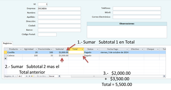 Como te decía este código lo anexas al evento Después de insertar del subformulario Registros. Cada vez que insertes un registro nuevo calcula la suma de Subtotal de todos los registros (previos más actual) que están en el subformulario, y pone ese valor en el campo Total.
