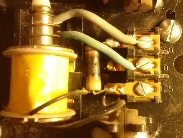 Alguien me ha roto el interruptor del timbre de la puerta y éste se ha quedado conectado un buen rato. Cuando me lo he encontrado así olía a quemado y al echar un ojo a la caja que contiene el percutor del timbre he visto que la resistencia que tiene se ha quemado, tal como puede verse en la fotografía.