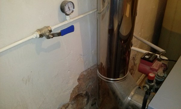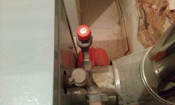 La llave abierta con un manómetro en el agua fria que viene del agua corriente de la casa y va a los tubos de la calefacción, que a su vez , van al inferior trasero de la caldera.