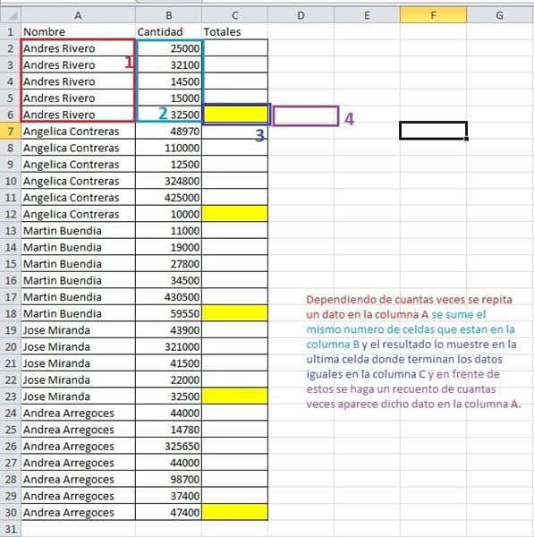 Como sumar un rango de celdas especifico, dependiendo de cuantas veces se repita un dato en otras celdas, Mirar imagen adjunta.