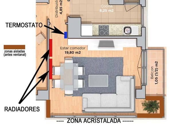 La estancia en cuestión tiene dos grandes radiadores que están correctamente dimensionados incluso teniendo en cuenta la gran cantidad de cristal (esto me lo ha verificado un arquitecto) pero el problema es que están situados los dos en la misma pared que además es la más alejada a los ventanales y además el termostato está muy cerca de los mismos. Este es el plano: