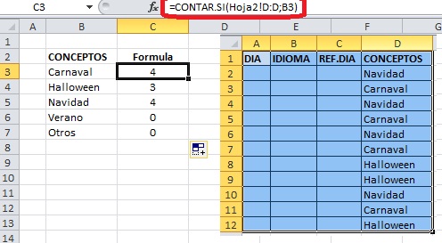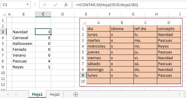 Lo que quiero es que en la Hoja1 se me sumen los conceptos que aparecen repetidamente en la Hoja2, es decir si en la Hoja dos como conceptos sale: Carnaval 6 veces /Navidad 15/ Verano 0/ Halloween 3 ... Quiero que sume las palabras repetidas y ponga el resultado en la Hoja 1.