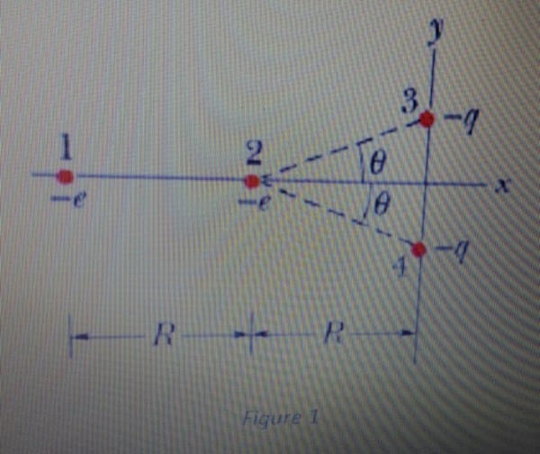 La Figura 1 muestra los electrones 1 y 2 en el eje y las cargas iones 3 y 4 de carga idéntica y a idénticos ángulos . El electrón 2 es libre para moverse. Las otras 3 partículas son fijadas de tal forma que se mantengan a distancia desde el electrón 2 y son puestos para mantener el electrón quieto. Para posibles valores físicos de ≤ 5. Cuál es el (a) más pequeño, (b) segundo más pequeño y (c) tercer valor más pequeño de para los cuales el electrón se queda en su lugar. Problema resuelto de física 2